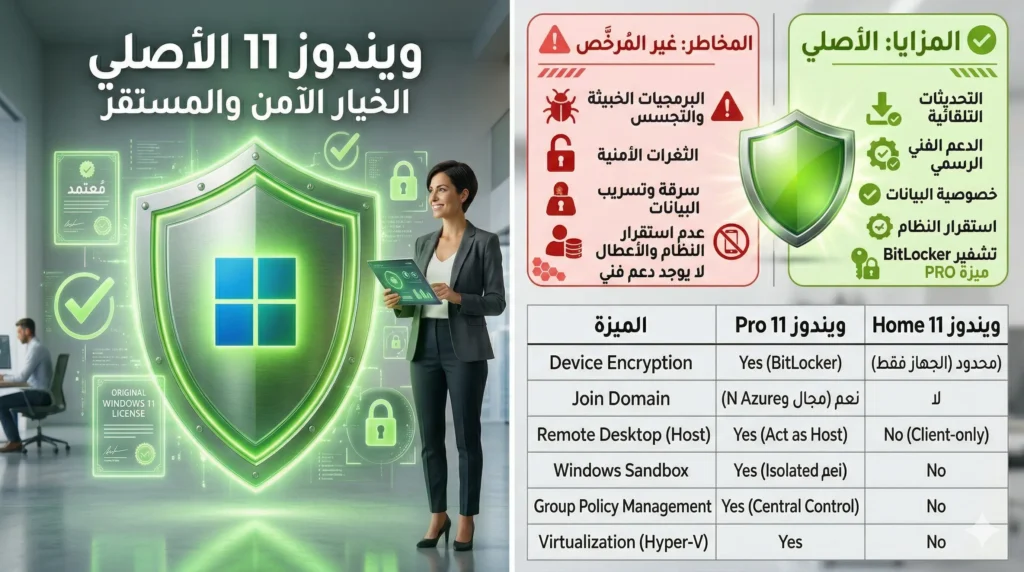 لذلك، لم يعد شراء ترخيص ويندوز 11 الأصلي مجرد رفاهية، بل أصبح ضرورة للحفاظ على جهازك وأعمالك، وضمان تجربة استخدام مستقرة وآمنة.