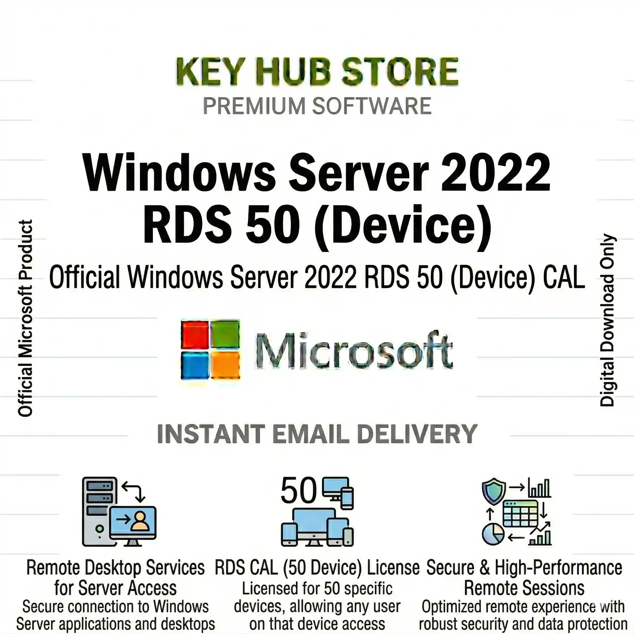 Upgrade your digital experience with Windows Server 2022 RDS 50 (Device). At Key Hub Store, we provide 100% genuine digital licenses delivered instantly to your email. Whether you are upgrading your home PC, outfitting a business, or securing your data, this product provides the premium features and security you need.